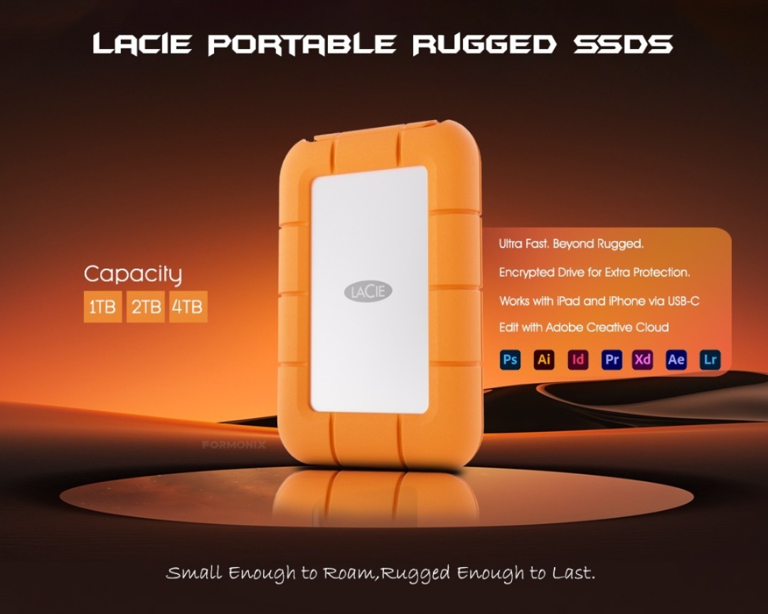 The LaCie Rugged Mini SSD takes your project from capture to backup in no time. USB 40Gbps and Thunderbolt 4 compatibility means read speeds up to 2000MB/s that are future-proof. Plug-and-play connectivity with Mac and iPad delivers a seamless workflow. Plus, its IP54 rating provides water, dust, and drop resistance.